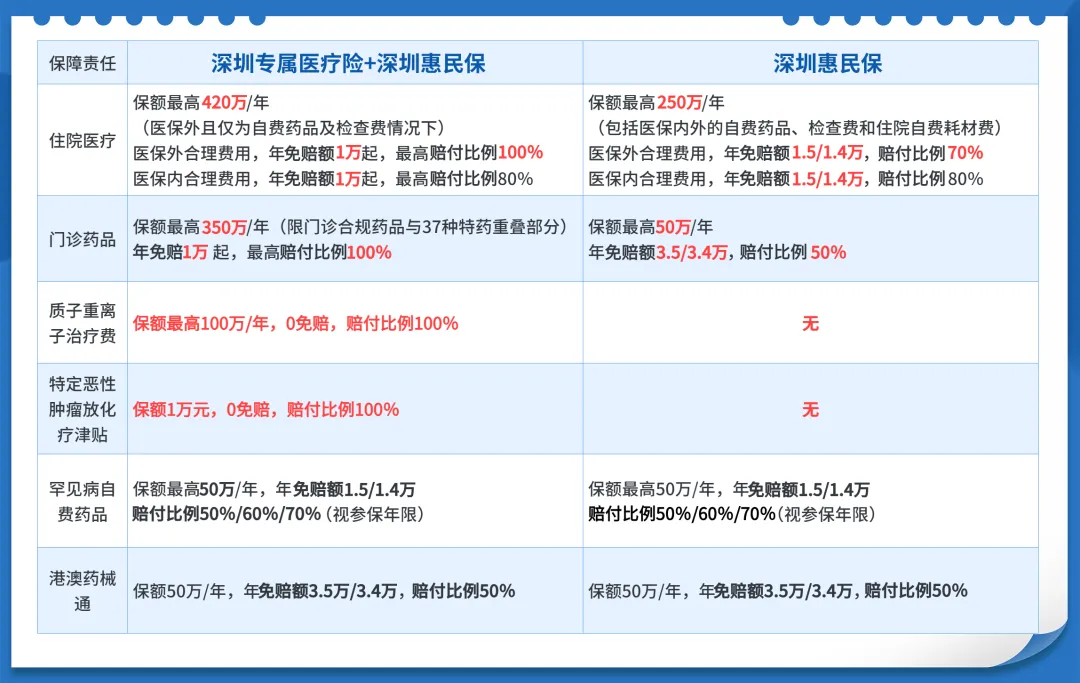 核心特点:政府背书,保障结构最完整(覆盖社保内/外、特药、质子重离子),可用医保个账支付。长期版锁定6年费率,一年期版保证续保3年。有健康告知,非全员可投。- 保障对象:非常广泛,包括:1) 深圳医保参保人(含港澳人士);2) 参保异地医保的深圳户籍人员;3) 在深工作/生活/学习的非深圳医保参保人(新市民)。不限年龄,无需健康告知。