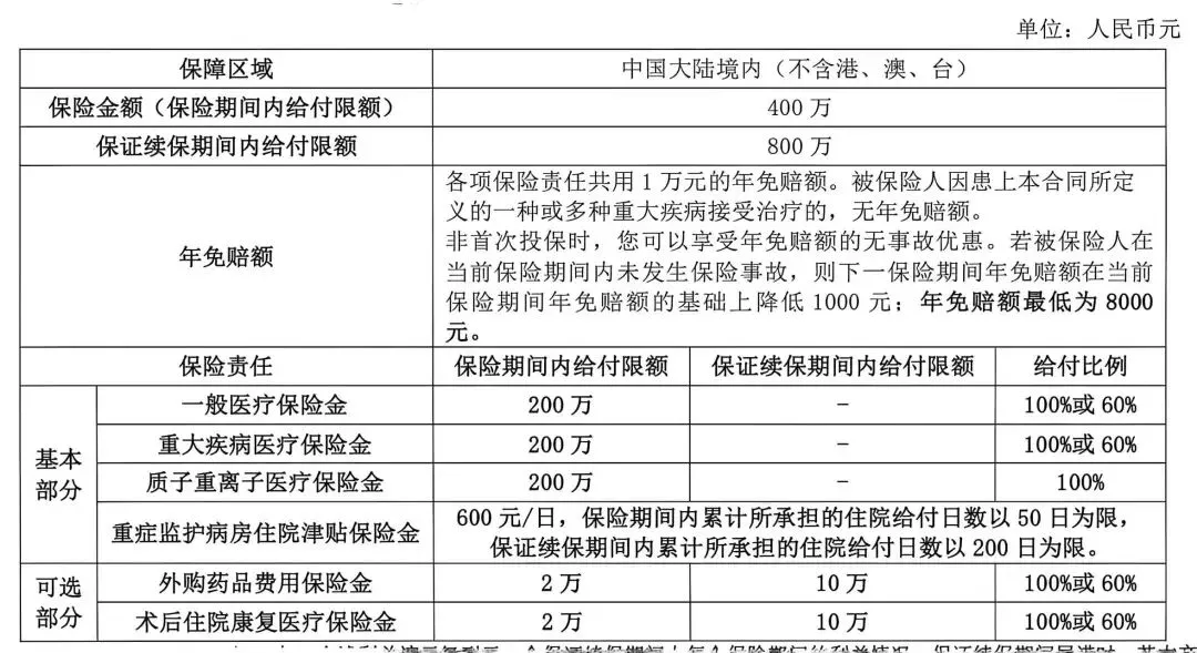- 免赔额:1.8万元/年。连续参保三年且无理赔,降至1.6万元。