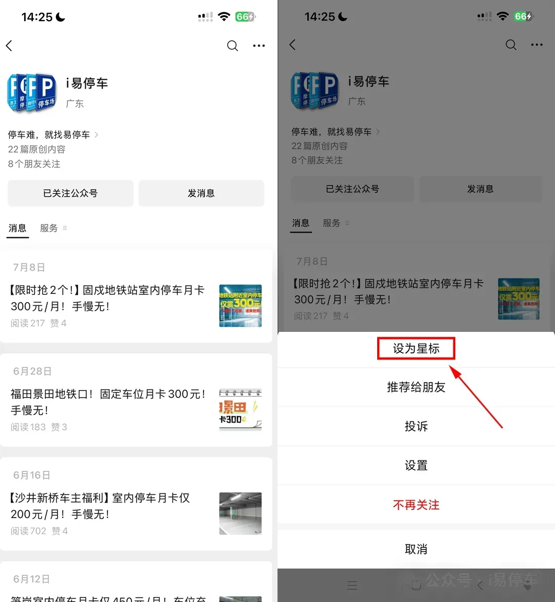 小伙伴们注意:i易停车每天不定时推送最新的停车信息,但因信息流乱序,不少人还是错过了干货!刺客建议大家把本公众号置顶(设为星标★),以便第一时间看到推送,方法如下图: