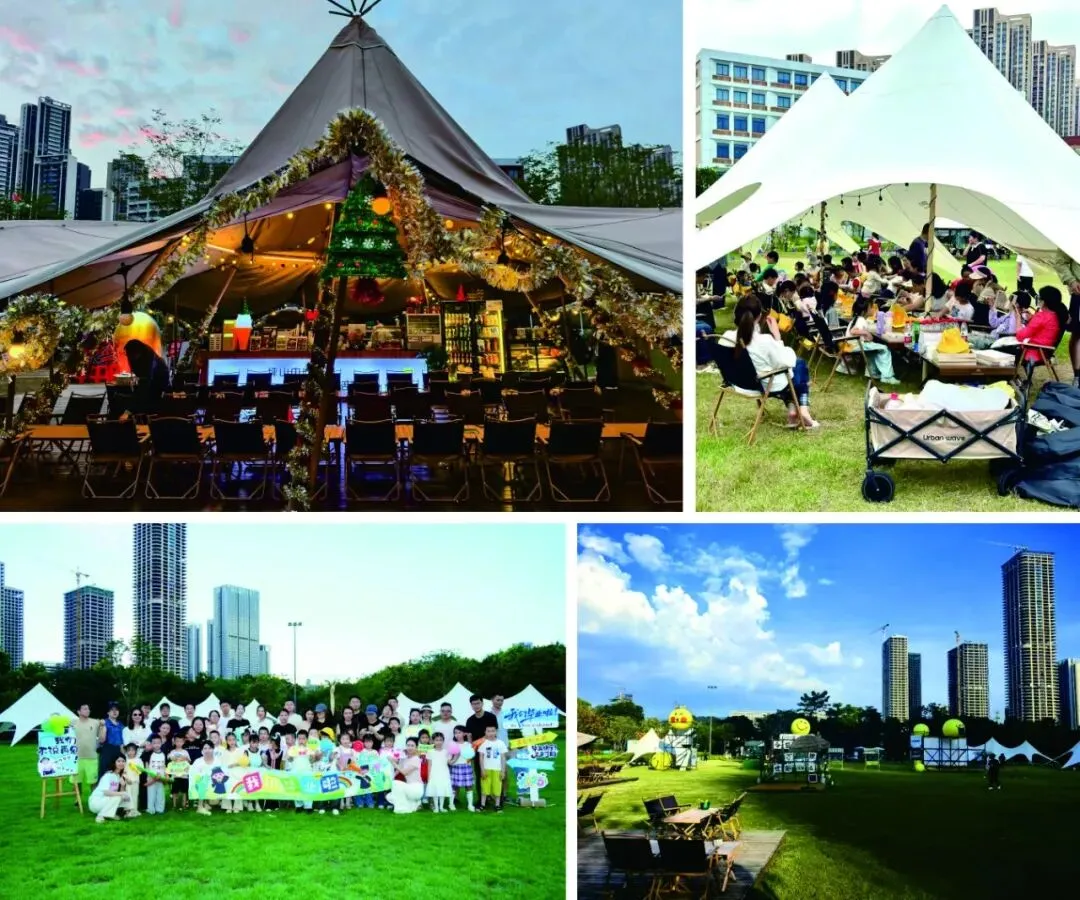 坪山中心公园,24万平方米的葱茏绿意如城市绿肺,是都市人逃离喧嚣的心灵栖息地。此次音乐会的举办地——城市生活营地,更是将自然野趣与都市惬意完美融合的潮流空间。5000余平方米的营地内,大片柔软草坪铺展在眼前,与便民露营区、市集区、打卡区错落交织,天幕、帐篷、桌椅等设施一应俱全。