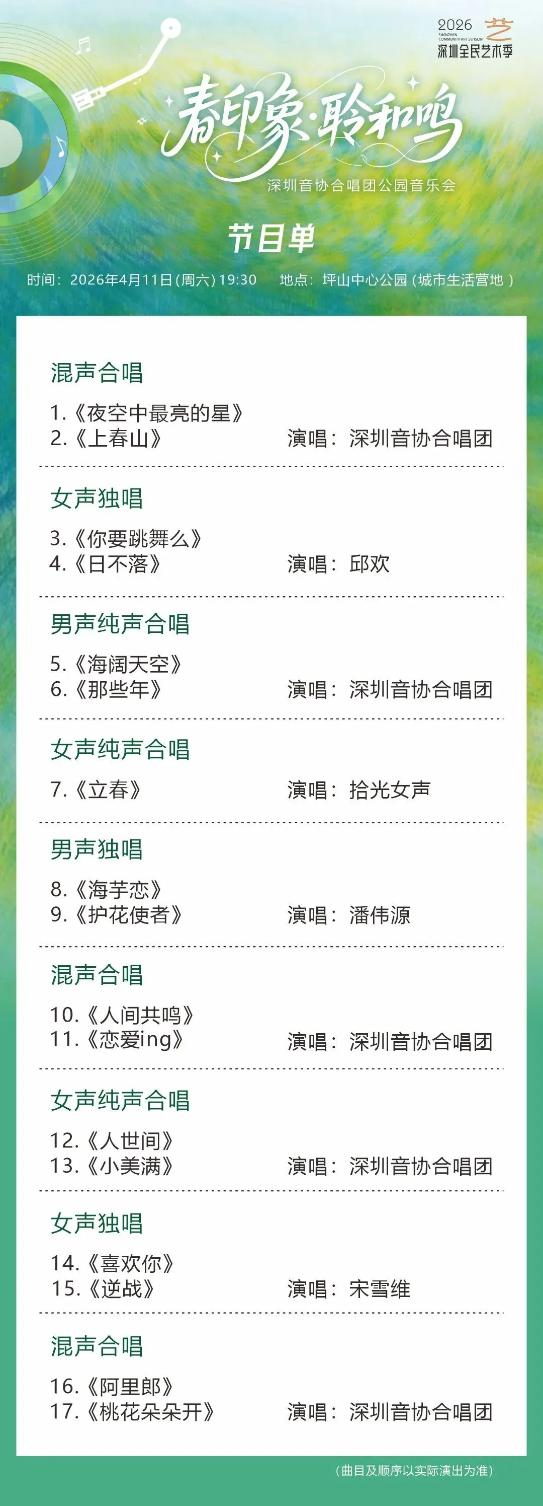 4月11日坪山绿境,和声相伴 我们不见不散!