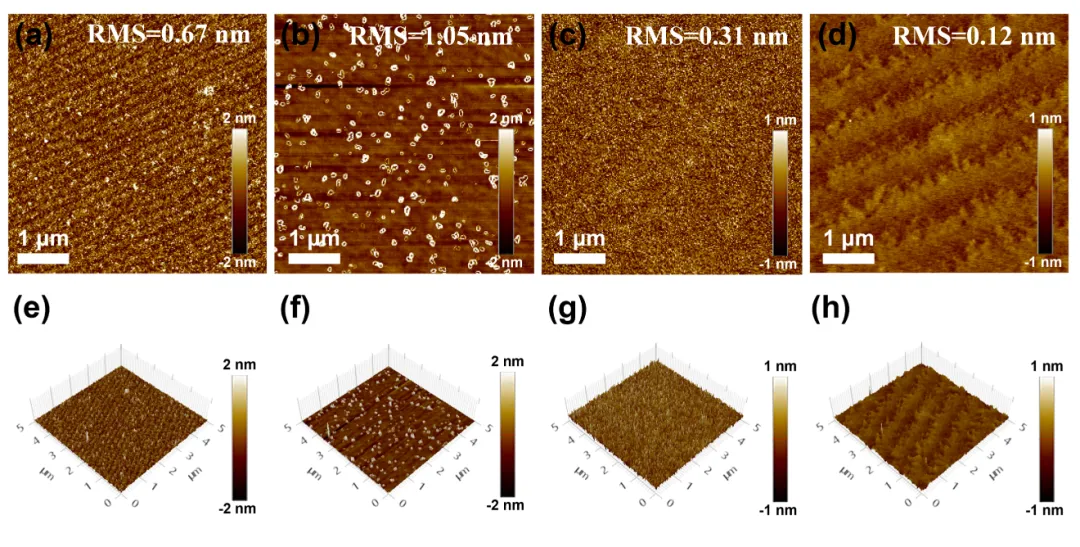 图1 氧化镓外延表面粗糙度(a)无表面处理;(b)ICP-RIE干法刻蚀后;(c)BOE湿法处理后;(d)ICP-RIE结合BOE湿法两步处理后。(e-h)对应工艺下的三维表面形貌图。
