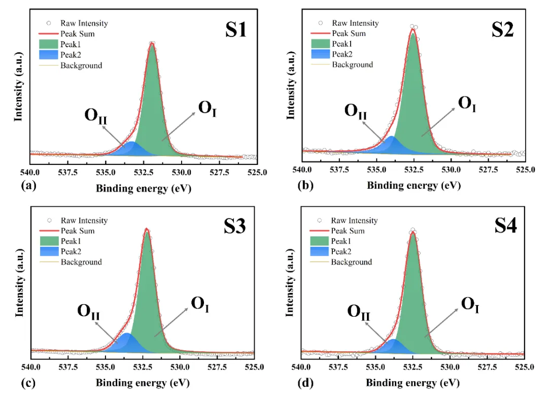 图2. 不同表面处理下,XPS提取的氧空位比例(a)无处理(14.3%);(b)ICP-RIE干法刻蚀(17%);(c)BOE湿法处理(13.2%);(d)ICP-RIE加BOE两步处理(11.6%)。
