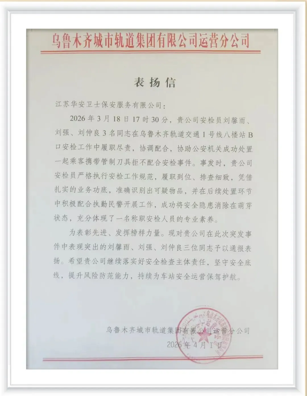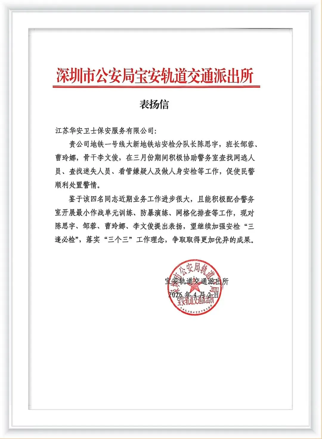 他们用冷静的处置、专业的业务功底,守住了地铁安检的第一道防线,这份来自运营分公司的肯定,是对江苏华安卫士“履职到位、排查细致”的最佳嘉奖。