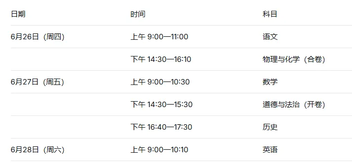 6月26日—6月28日 中考文化课考试