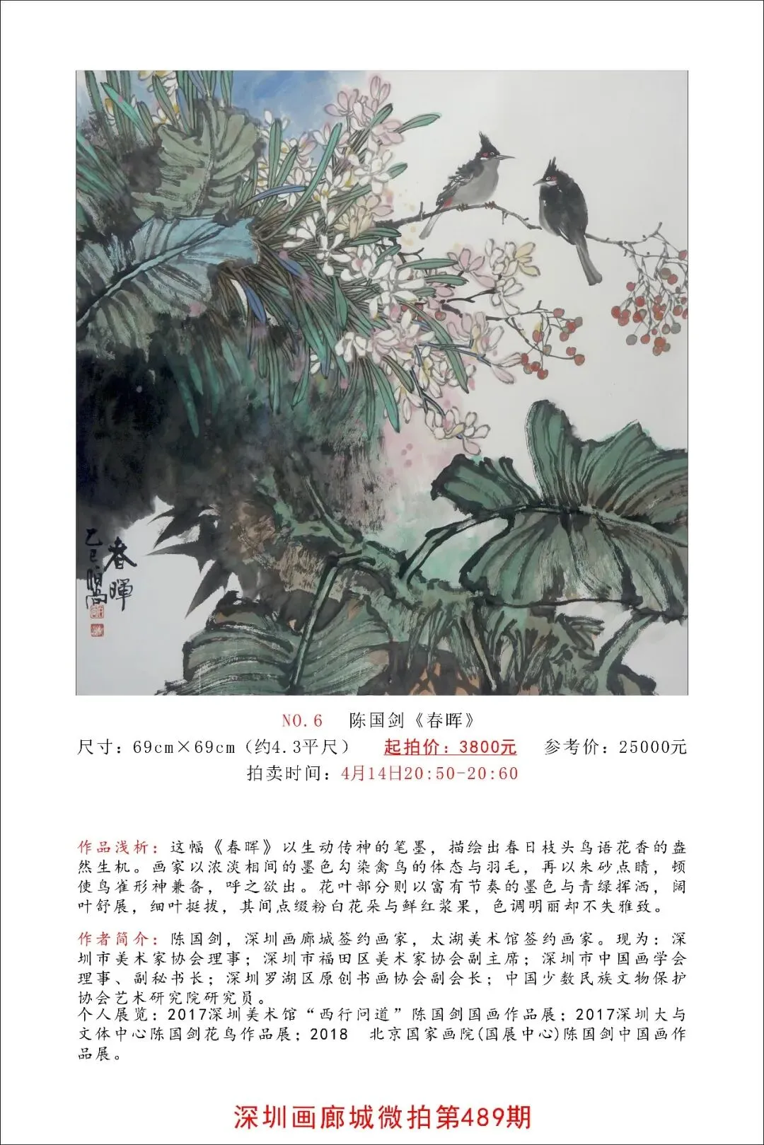 个人展览:2017深圳美术馆“西行问道”陈国剑国画作品展;2017深圳大与文体中心陈国剑花鸟作品展;2018 北京国家画院(国展中心)陈国剑中国画作品展。