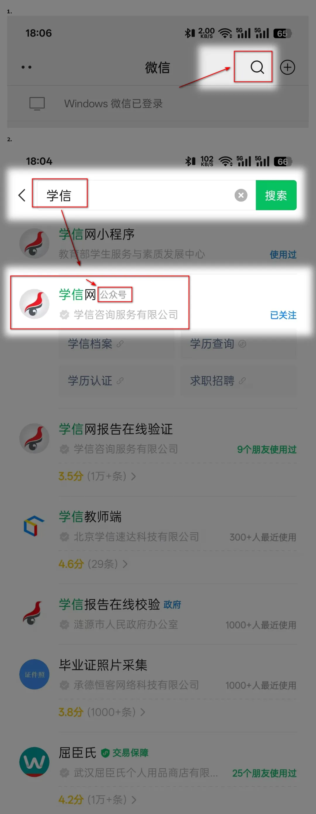 1、打开微信,进入搜索页面搜索学信网公众号并进入。