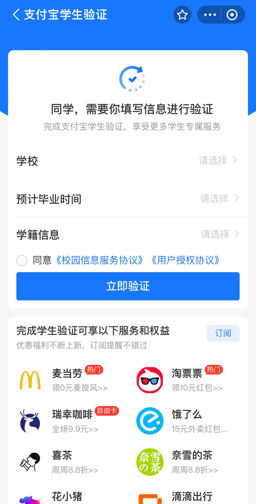 操作流程:支付宝搜索并进入【学生验证】,点击【支付宝学生验证】,输入学历信息,据指示获取学籍验证码进行验证。