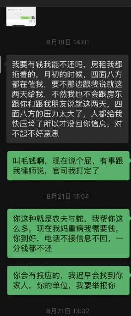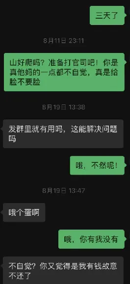 > 借钱时好话说尽,还钱时推三阻四,连信息都不回。当事人放话:再不给说法,就去法院告你!