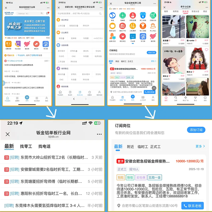 微信直接登录,不用注册不用下载更省事!行业圈子,钣金铝单板全产业链,行业资源整合对接平台,有公众号信息快捷入口、曝光栏,找工作、找零工,查电话、找设备、找维修、找图纸、找对象、交流大厅、行业资讯、资源宝库等