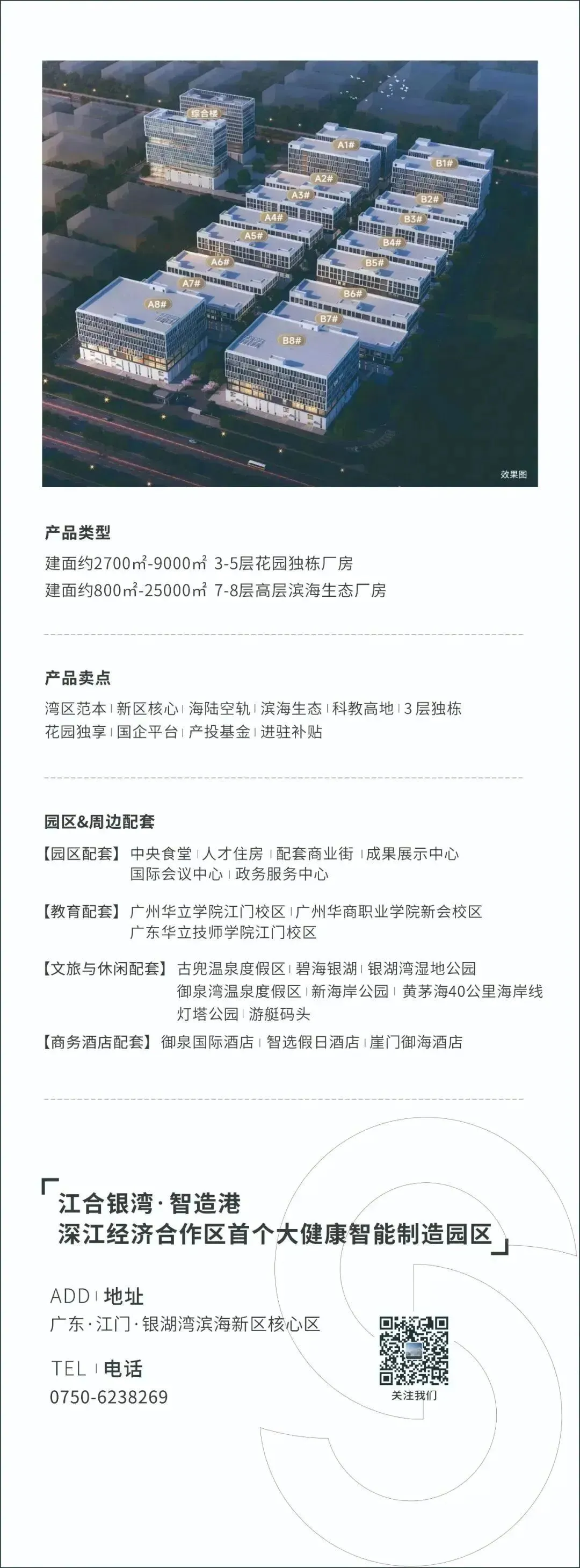 与此同时,江合银湾·智造港面向银发经济相关产业,同步推出50年产权、可分割红本的高标准厂房,同时配套综合楼,入驻企业可享成果展示中心、国际会议中心、人才公寓、餐厅等全方位配套及一站式运营服务体系,还有超8亿元专项产业基金,让企业实现“拎包入住”,“轻装上阵”。现诚邀银发产业相关企业协同布局,共同夯实珠江口西岸银发产业的制造基础。