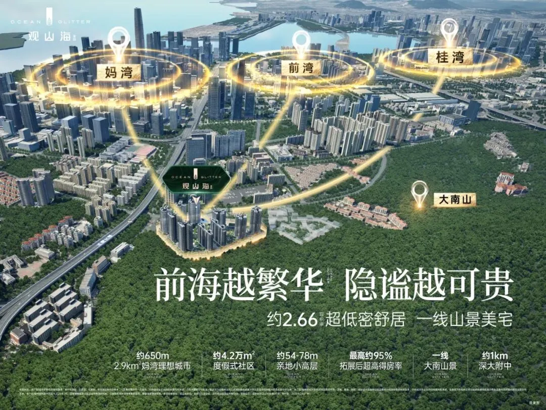在区位上,项目毗邻大南山,属于南山中心区荔湾板块,靠近前海妈湾片区和蛇口片区;附近有妈湾在售的万科瑧湾悦价格在10.5万,观山海家园售楼处电话:4008368707,以及即将入市新盘有妈湾的前海招商臻玺预计在10万左右,项目这两个项目观山海花园并不在妈湾核心位置,属于比较边缘地界了,后面入市大概率价格方便也会稍微比较低一些,项目相比于这两个小区优势在于景观背山面海以及大社区花园。