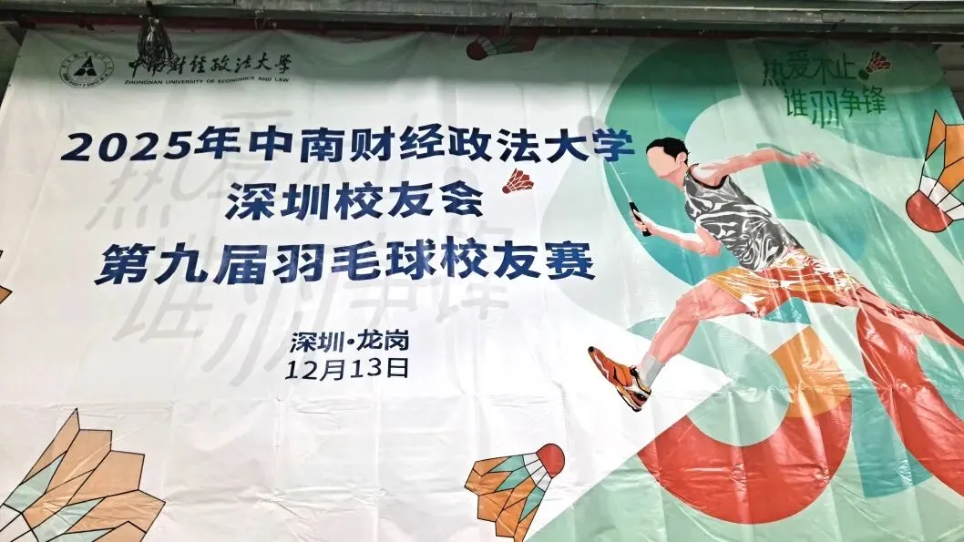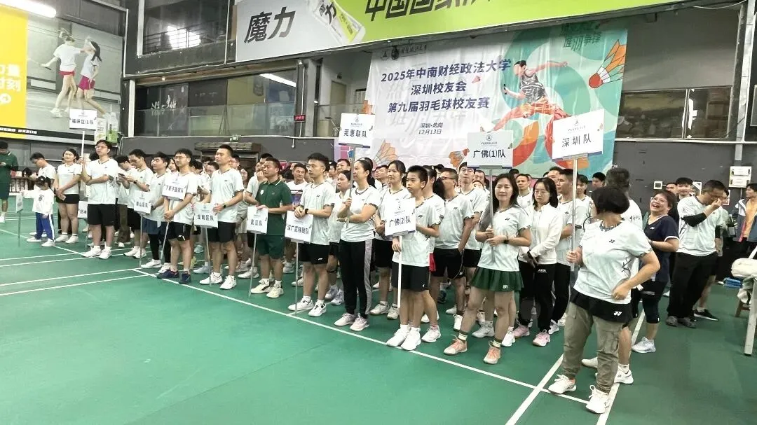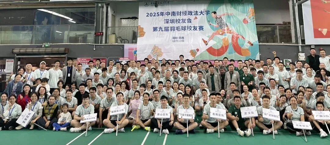 2025 年 12 月 13 日,中南财经政法大学深圳校友会第九届羽毛球校友赛暨全国各地校友交流赛在深圳市龙岗区大生智能运动中心圆满收官。赛事由中南财经政法大学深圳校友会主办,深圳中埔信科技集团有限公司承办。中南财经政法大学校党委副书记、纪委书记申祖武教授莅临指导,比赛吸引了来自武汉、广州、佛山、陕西等地的校友参赛,甲乙两组展开了激烈角逐。
