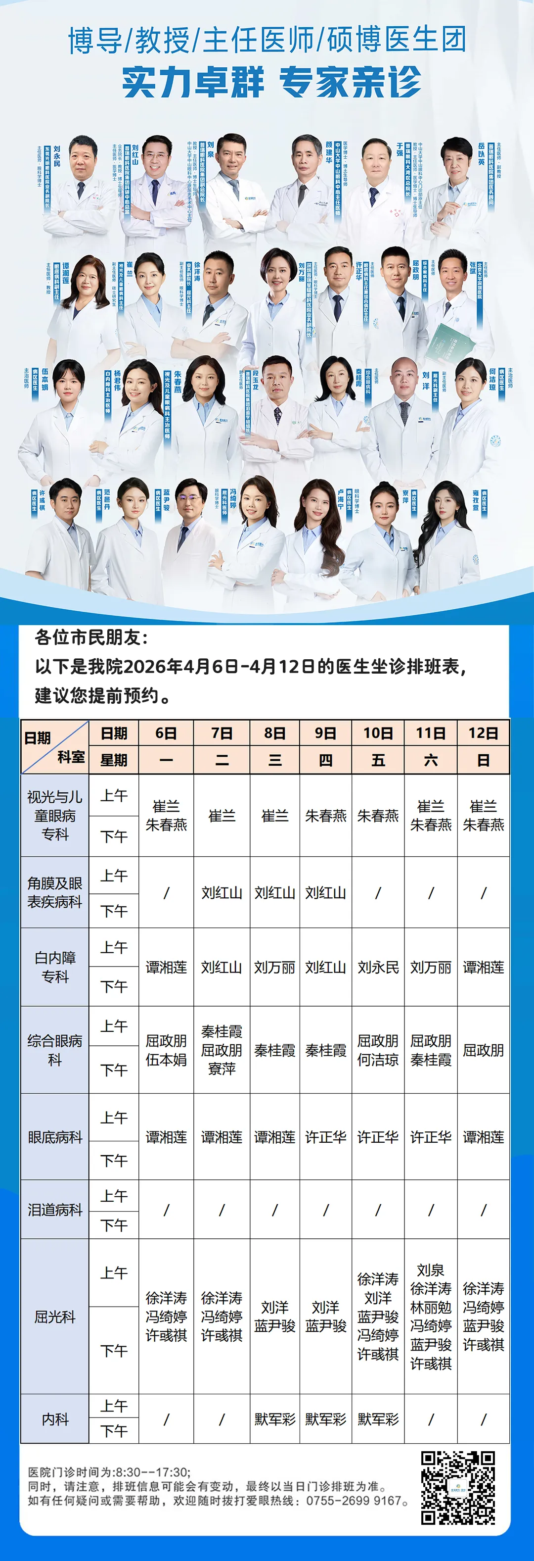 >深圳普瑞眼科医院本周(4月6日-4月12日)医生坐诊排班表新鲜出炉啦!