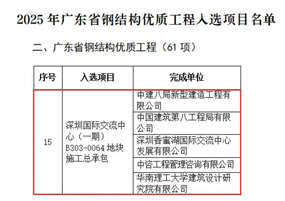 近日,2025年广东省钢结构优质工程名单正式公布,深圳国际交流中心会议中心成功入选。该项荣誉,是对项目团队在钢结构工程领域创新能力与工程品质的权威认可。