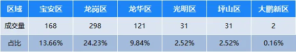 宝安区成交168套,占全市成交的13.66%;