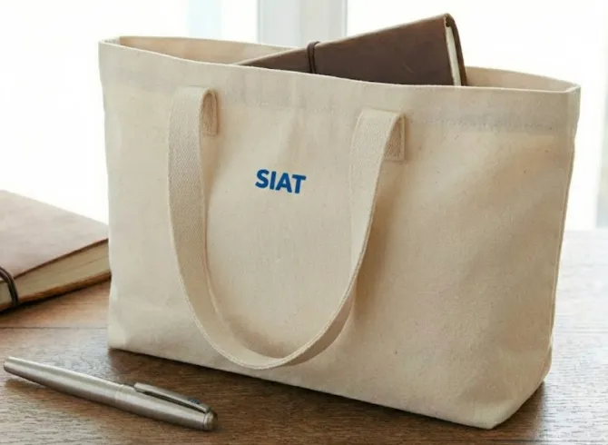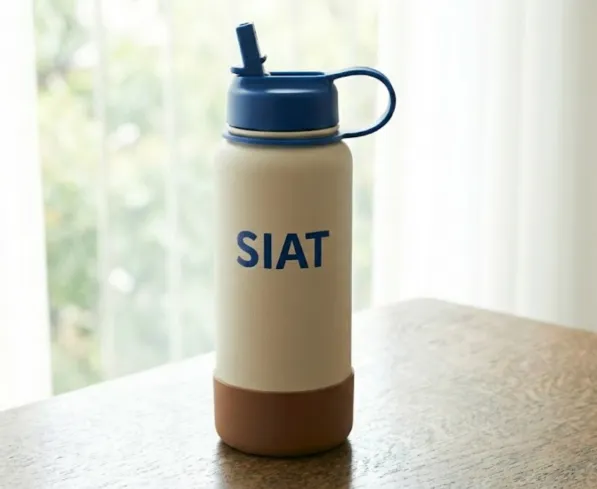 运动水杯:采用米白色哑光杯身,侧面点缀深蓝色“SIAT”英文字标,整体视觉清新且富有律动感。