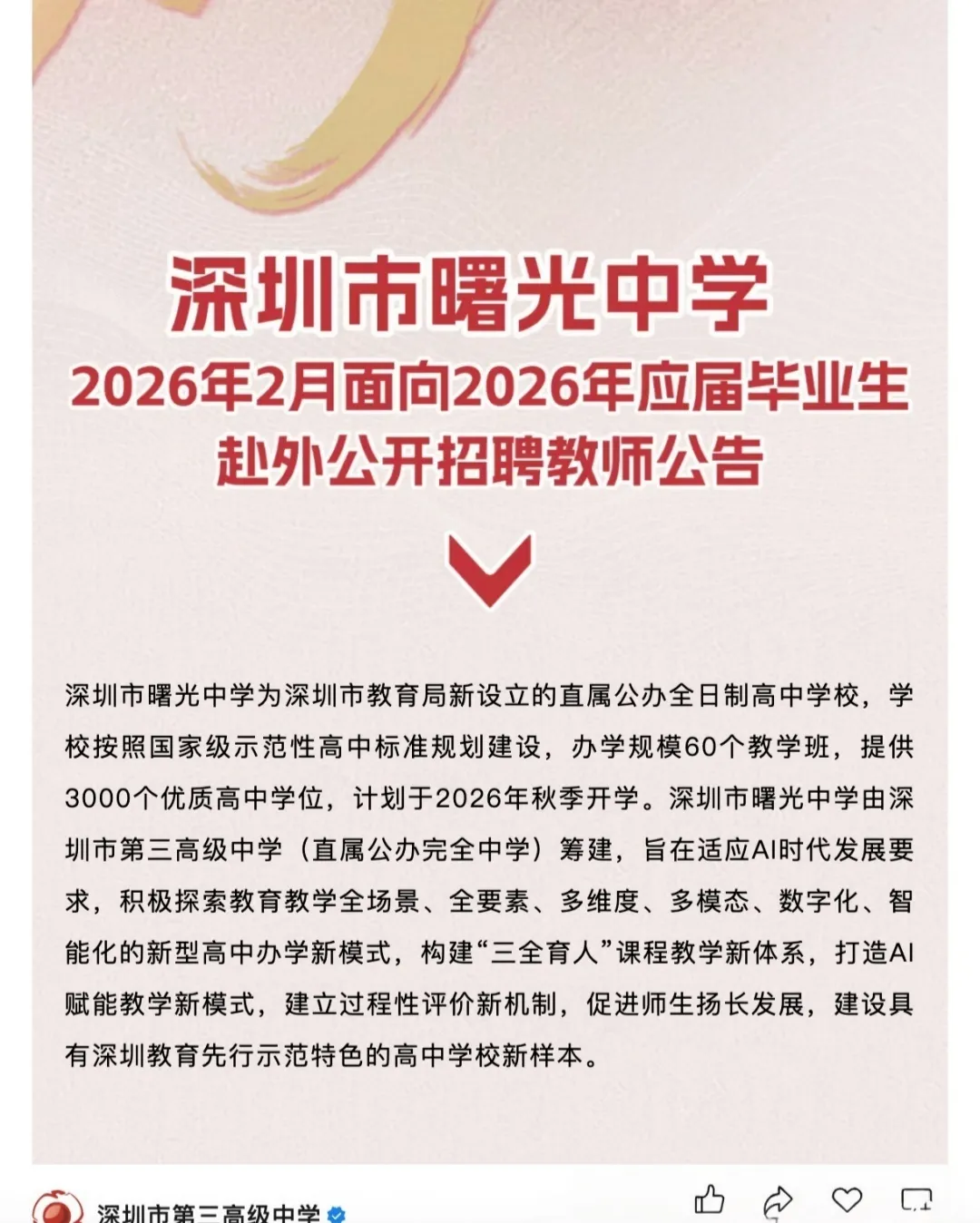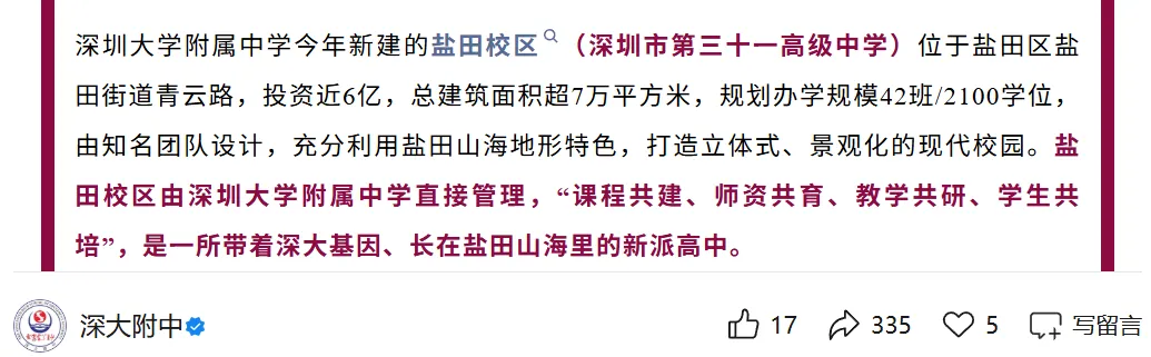 学校将于2026年提前借址深大附中初中部招生,首届计划招生300人