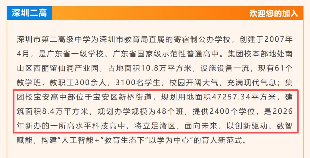 二高宝安高中部位于宝安区新桥街道,规划用地面积47257.34平方米,建筑面积8.4万平方米,规划办学规模为48个班,提供2400个学位,是2026年新办的一所高水平科技高中,将立足湾区、面向未来,以创新驱动、数智赋能,构建“人工智能+”教育生态下“以学为中心”的育人新范式。
