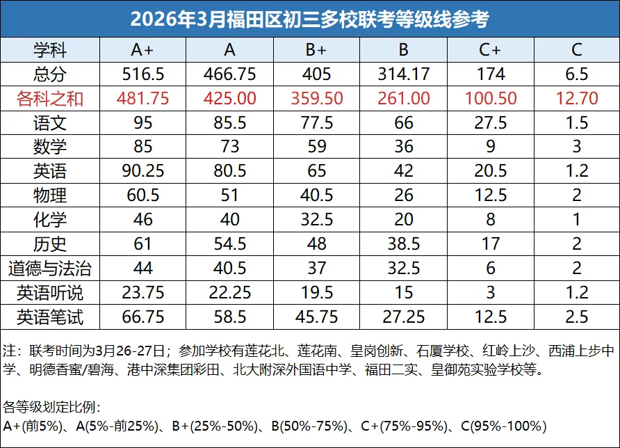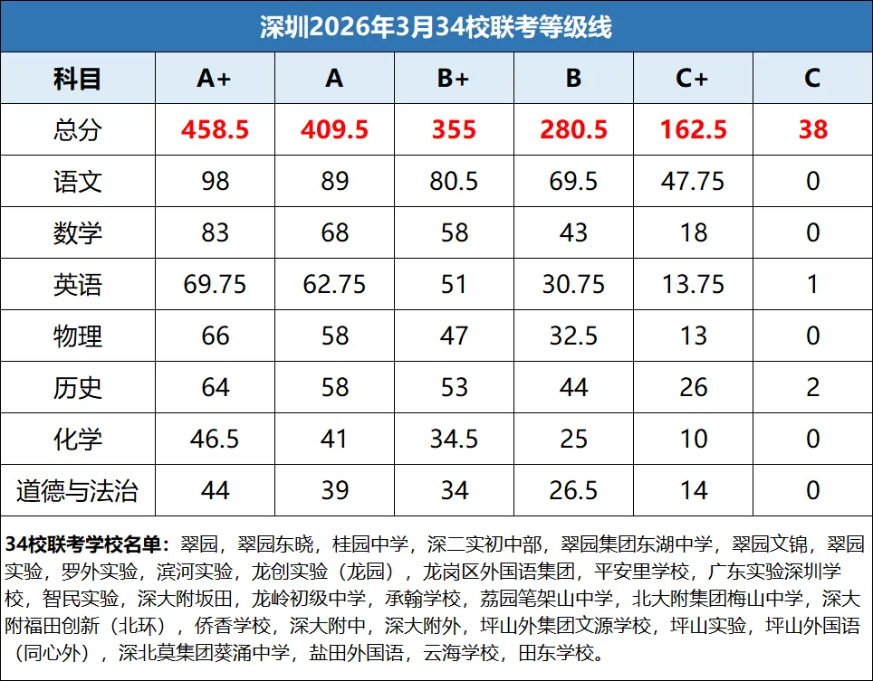 综合往年数据可知,单科等级A+线之和基本对接深圳四大名校录取水平,单科等级A线之和基本对接深圳前四十大高中录取水平。如果学生总分等级线>单科A+等级线之和,那么大概率有冲击四大的实力;达到单科A线之和,基本上可以稳冲前四十大高中。