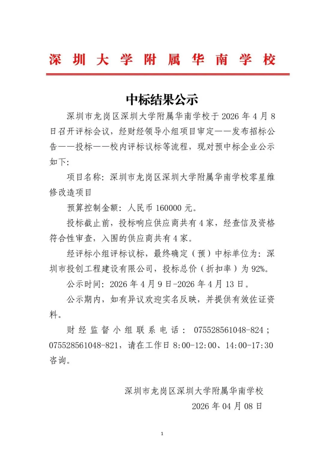 【中标公示】深圳市龙岗区深圳大学附属华南学校零星维修改造项目中标