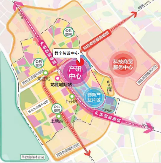龙华数字智造中心位于龙华超级商圈,地处龙华商贸服务中心与产研中心发展双芯辐射叠加区,周边产业资源高度富集,富士康深圳基地、华为九龙山科技城等先进制造业基地环绕,深度融合数字经济与先进制造业,形成完善成熟的产业生态圈。