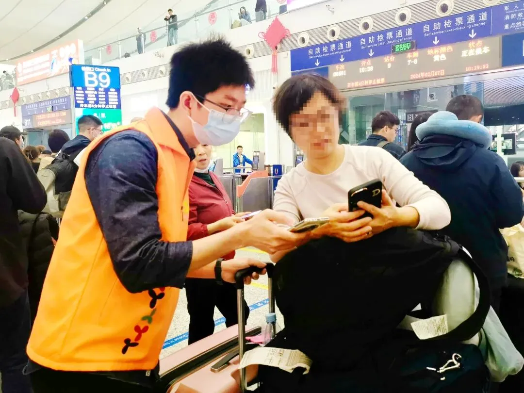 春运期间的深圳北站,面对从国外返乡、无电话卡、流量用尽而焦虑无助的曾阿姨,他耐心安抚,开通热点协助联系家人,并与其他志愿者一同搬运行李,嘱托同行旅客照应。