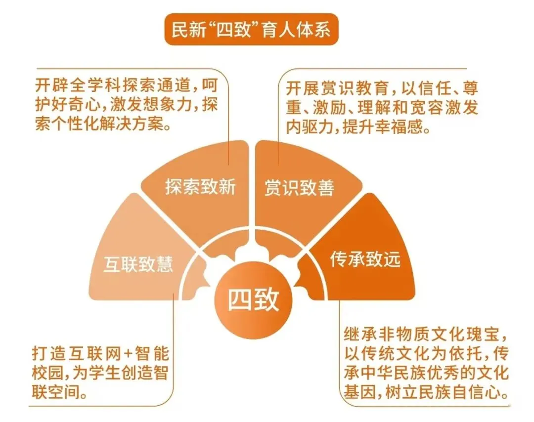 美思I尚美是教育给孩子最好的礼物。民新学校聚焦“四致”:互联致慧、探索致新、赏识致善、传承致远,培养德智体美劳全面发展的人,培养创美创新的中华美少年。