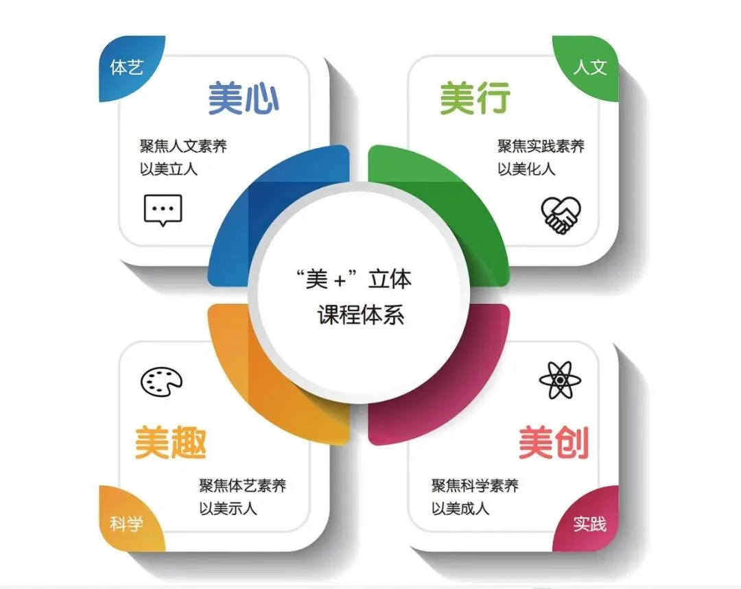 课程体系坚持国家课程、拓展课程与特色课程协同推进:严格开足开齐国家课程,落实五育并举;开设科学、国际、人文、美育、劳动五大素养拓展课程;同步构建德育特色课程,润育学生美好心灵,全面培育适应未来社会的核心品格与关键能力。