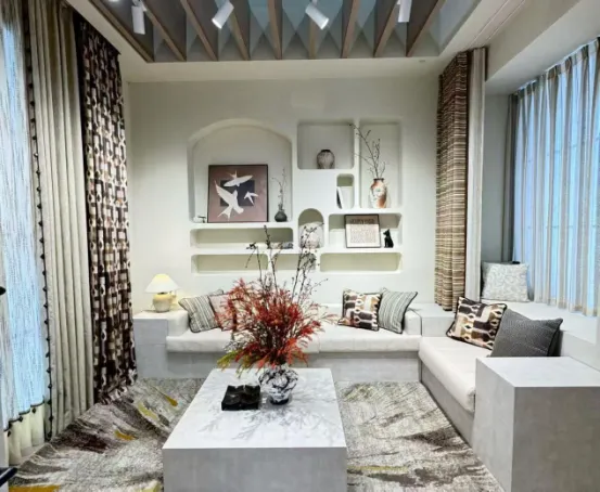伊伊布舍的差异化路径则更为极致。总经理张健林在专访中直言:“内卷时代,唯有产品与服务才能真正突围。”本次展会,伊伊布舍重磅推出静奢风、东方雅奢、野奢风、高奢风四大趋势系列,在材质上做加法、色彩上做减法,创新性地将客厅窗纱与背景墙独立成系,以复杂特种混纺工艺提升模仿门槛;更引入粤绣工艺,区别于行业常见的苏绣,用重工肌理与东方美学,打造出“人无我有”的产品标签。