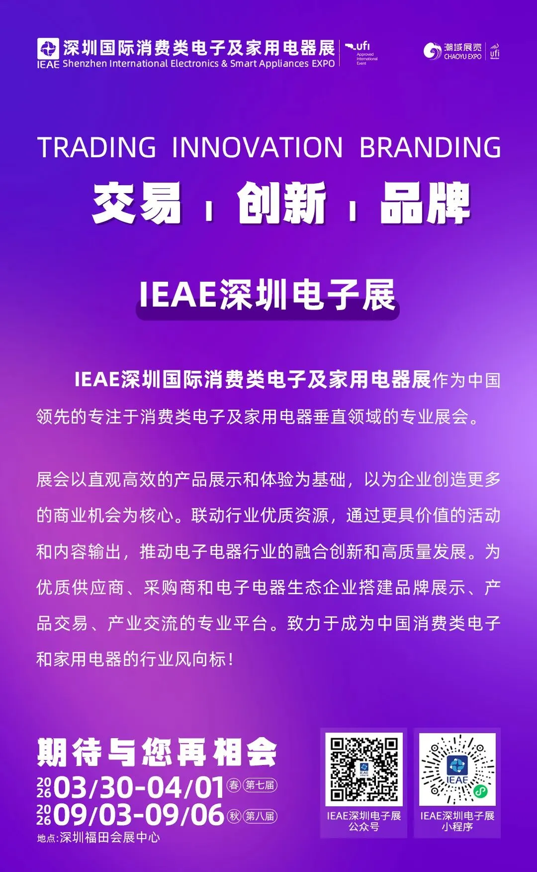 作为消费类电子及家用电器行业的风向标,本届IEAE深圳电子展不仅呈现了行业前沿的产品与技术,更以高效的供需对接能力,交出了一份沉甸甸的答卷:千家源头工厂及品牌、十万款潮流新品爆款、数万名专业买家……每一次握手、每一份意向,都是对IEAE深圳电子展作为一站式采购平台价值的最好证明。
