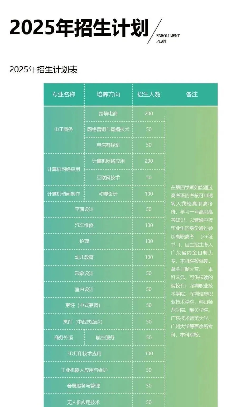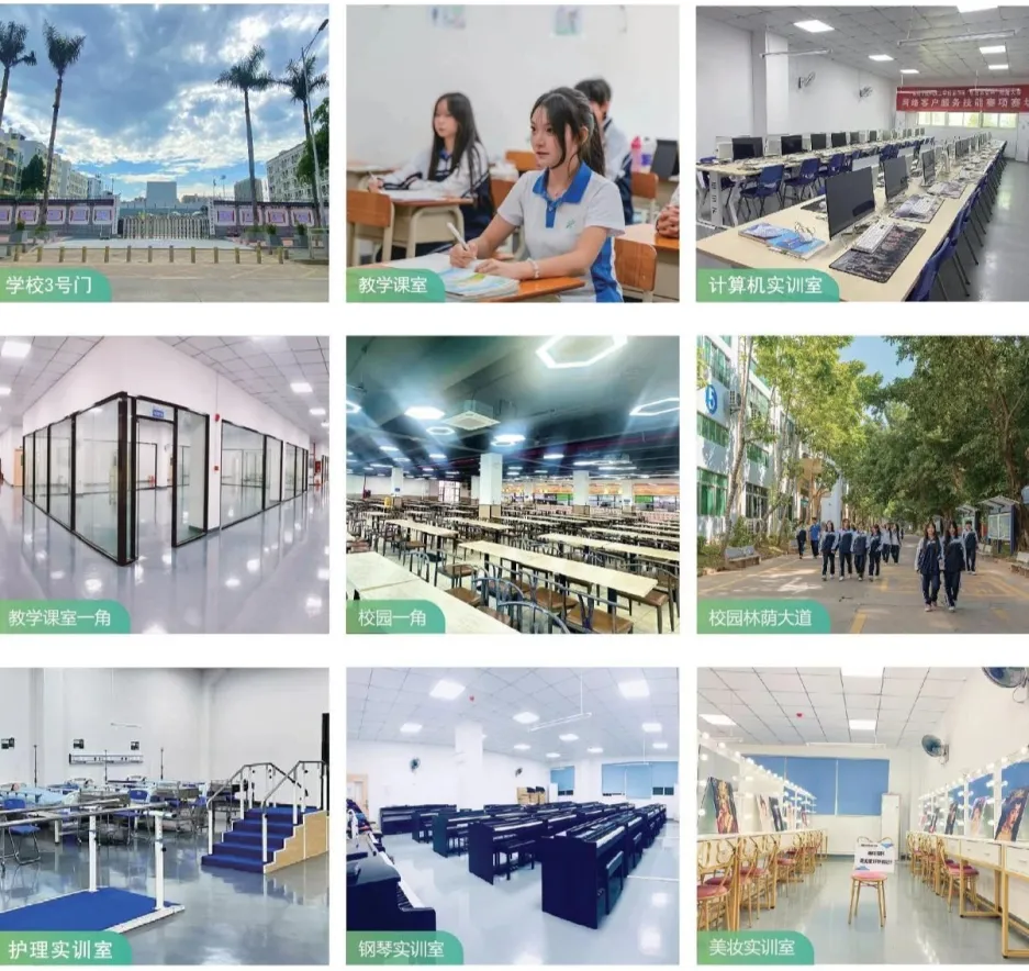 校园内,学生公寓、食堂、生活超市、医务室、足球场、篮球场、排球场、乒乓球场、卡拉OK厅、报告厅等生活体育娱乐设施一应俱全。学校开设有航空服务专业、3D打印技术、工业机器人、会计、电子商务、动漫设计、平面设计、幼儿教育、烹饪、汽车维修、市场营销等近二十个热门专业,集技工教育、大专、本科学历教育、出国留学、技能培训、就业服务于一体,是深圳市职业教育行业最具发展潜力的技工学校之一。