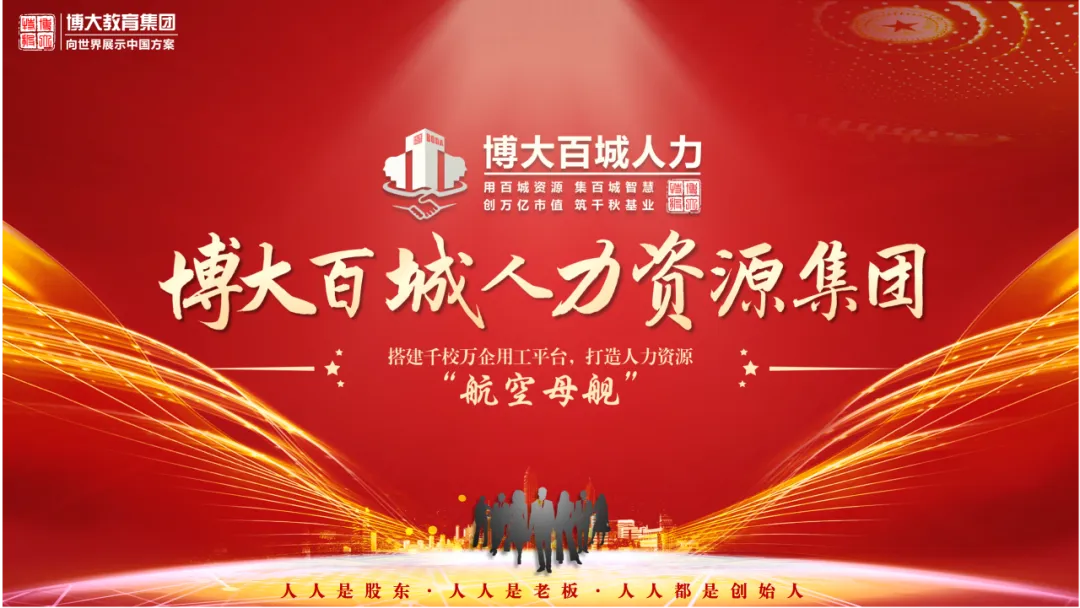 博大百城人力资源集团是深圳博大教育集团依托二十七载“AI+教育+人力资源”的深厚积淀,为贯彻落实国家“人才强国”战略及“加快发展新质生产力”部署要求,以期赋能中国实体经济发展及中国产业升级,而打造的人力资源战略平台。平台旨在联合100家优质人力资源机构,开展生态联营,突破行业同质化竞争壁垒,推动“同业联盟、异业协同、抱团发展”的共生格局,构建集智能匹配、产教融合、职业成长于一体的人力资源服务新生态,致力于寻求人力资源协同决策权,致力于打造中国人力资源的航母,致力于打造中国人力资源行业最大的蓄水池。