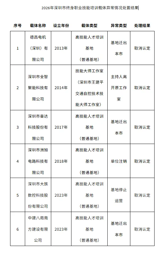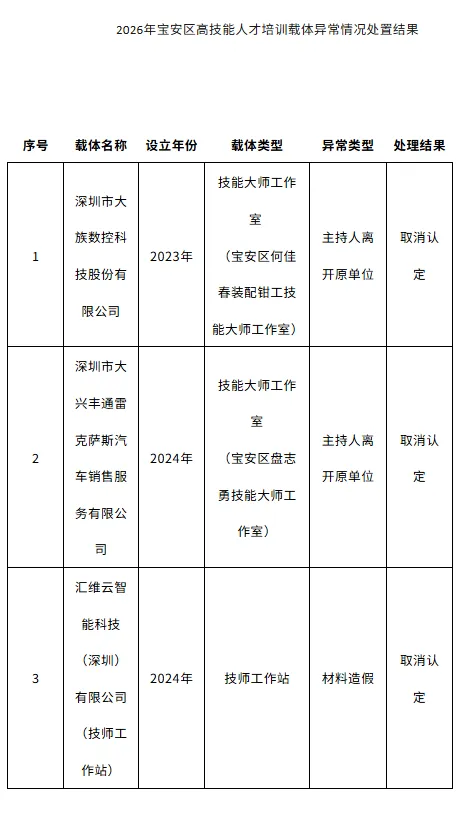 关于2026年深圳市终身职业技能培训载体及宝安区高技能人才培训载体异常情况处置结果的公示