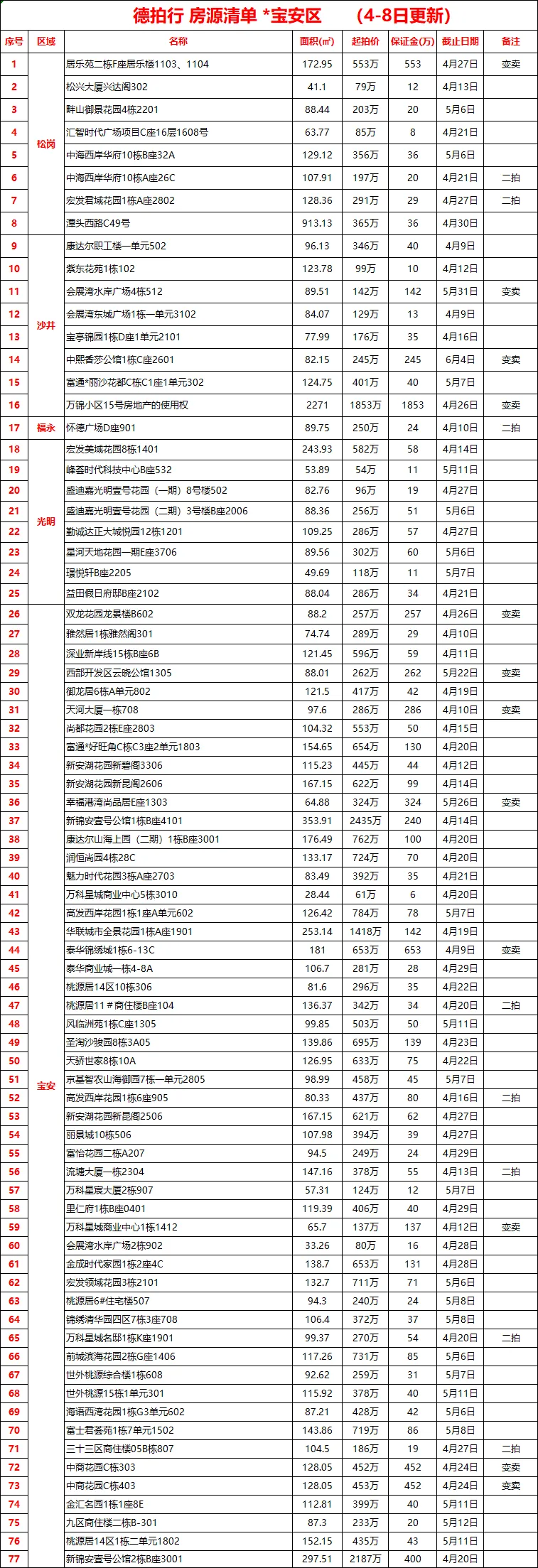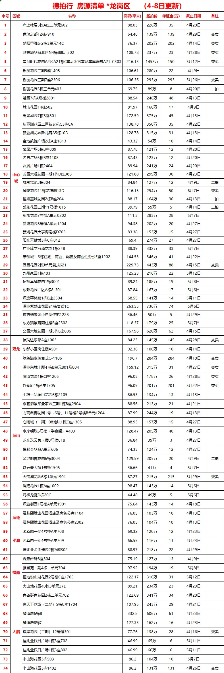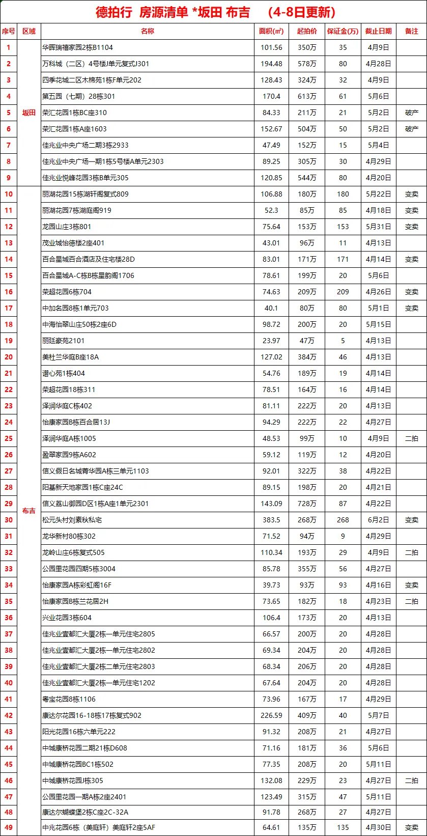 深圳德拍行科技信息有限公司(以下简称“深圳德拍行”)成立至今,是深圳第一家专业从事国有企业、法院、检察院、银行房产处置拍卖代理的信息咨询公司,致力于在资产重组、产权交易代理投资风险控制等相关领域提供全面的资产管理咨询(包括资产尽职调查、拍卖咨询、全程代理拍卖、代办过户文件、清理移交障碍、实物移交、按揭贷款、清理过户障碍、协助权证过户等一系列服务),帮助客户分析、制定具备可操作性的最优解决方案,为客户及商业伙伴创造真正的效益和价值。德拍行为您筛选深圳全市拍卖房源信息如下:、