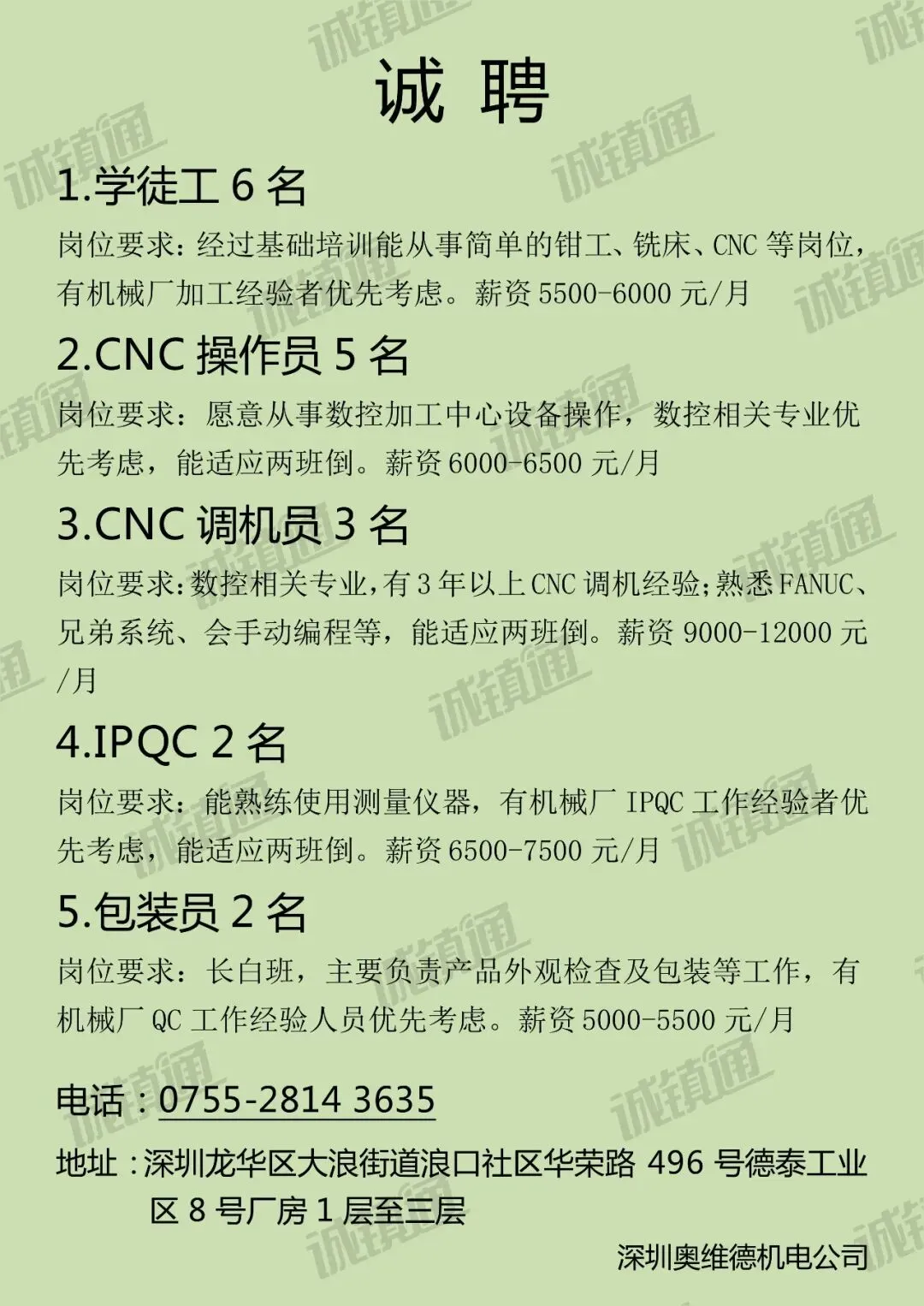 【深圳招聘】6200/月 停车收费员,23/h 图书整理员,6000/月 生产操作工