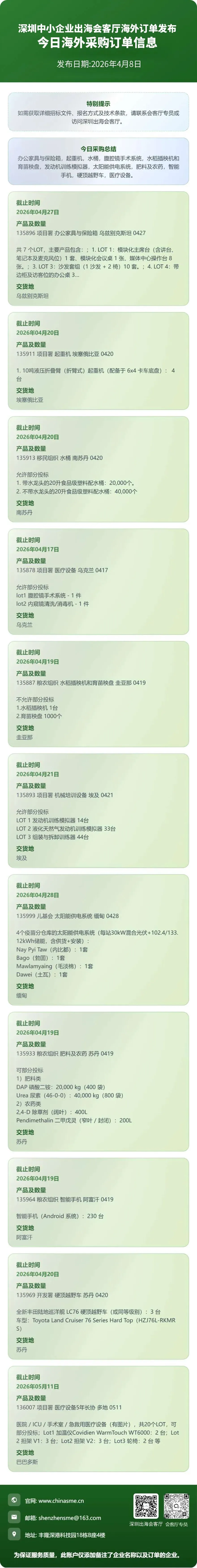 【深圳中小企业出海会客厅】2026年4月8日海外采购订单信息