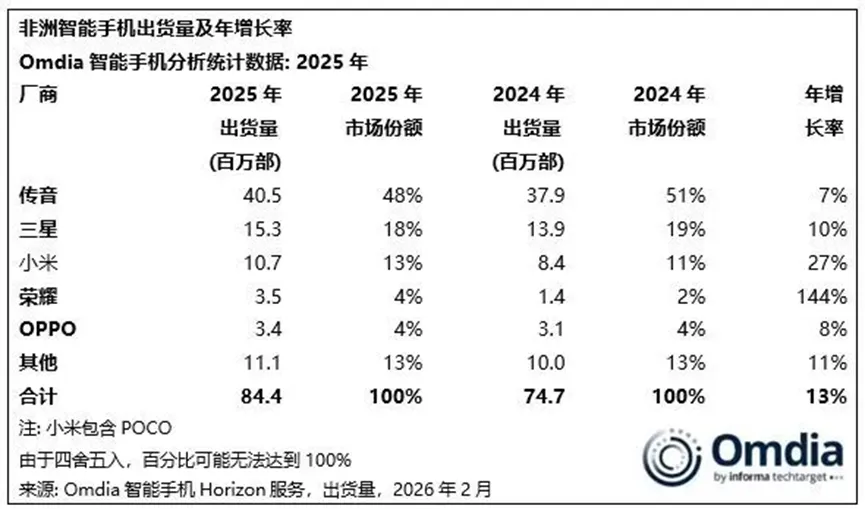虽然传音控股目前在非洲智能机市场占有率依然排名第一,但增长势头明显乏力。Omdia研究显示,2025年传音在非洲的智能手机出货量达到4050万部,增幅仅为7%,与小米的27%、荣耀的144%相距甚远。