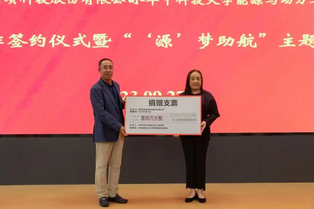 捐赠仪式上,深圳市星源材质科技股份有限公司陈秀峰校友向学院捐赠100万元并设立“星源材质学生活动基金”鼓励能源学子全面发展,华中科技大学教育发展基金管理处处长黄坤华代表学校接受捐赠支票。