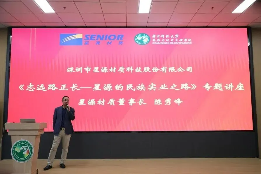 星源材质董事长陈秀峰校友致辞,回顾了他在华中理工大学的求学时光,表达了对母校培育的感恩之情与对学校发展的高度关注。他介绍了星源材质科技股份有限公司在锂电池隔膜领域取得的世界领先成就,并表示将以本次合作为起点,凝聚更多校友,为学校学院的学科建设与人才培养做出更大贡献。