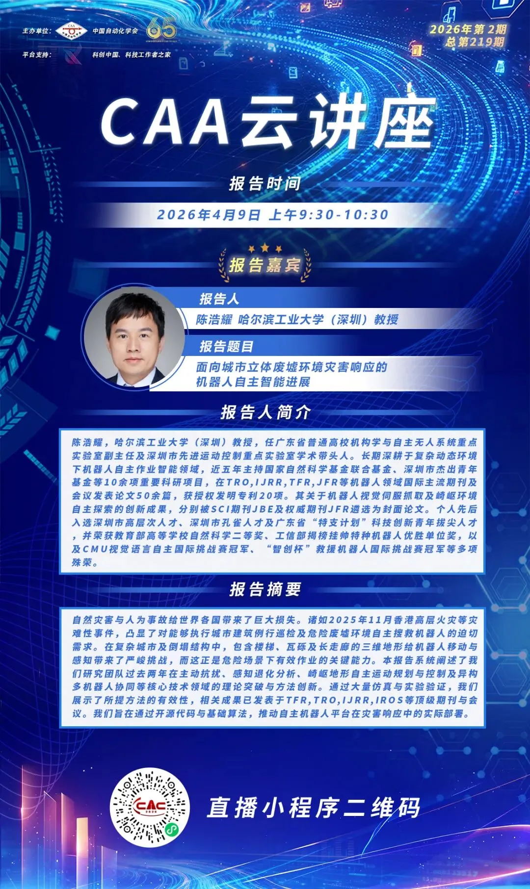 2026年中国自动化学会第2期(总第219期)云讲座将于2026年4月9日(周四)上午9:30召开,我们邀请到了哈尔滨工业大学(深圳)陈浩耀教授,带来题为“面向城市立体废墟环境灾害响应的机器人自主智能进展”的报告,并邀请到湖南大学教授缪志强主持。精彩内容,敬请期待!