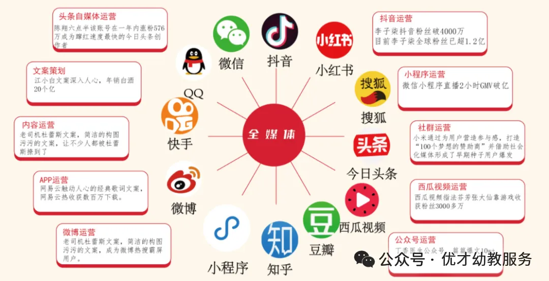 全媒体运营师共五个职业方向,分别为创意策划、视听运营、直播运营、流量优化 。结合全媒体运营师自身能力的提升,其可适用于企业中的多个部门多种职位:☞企划部: