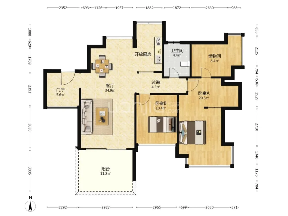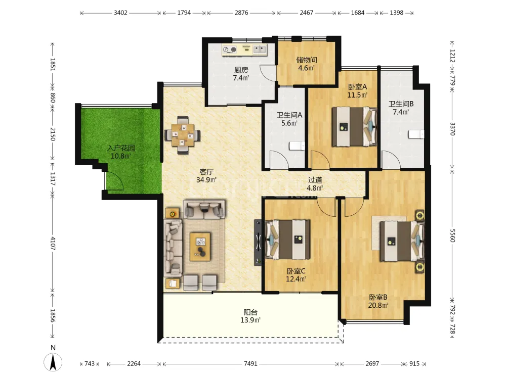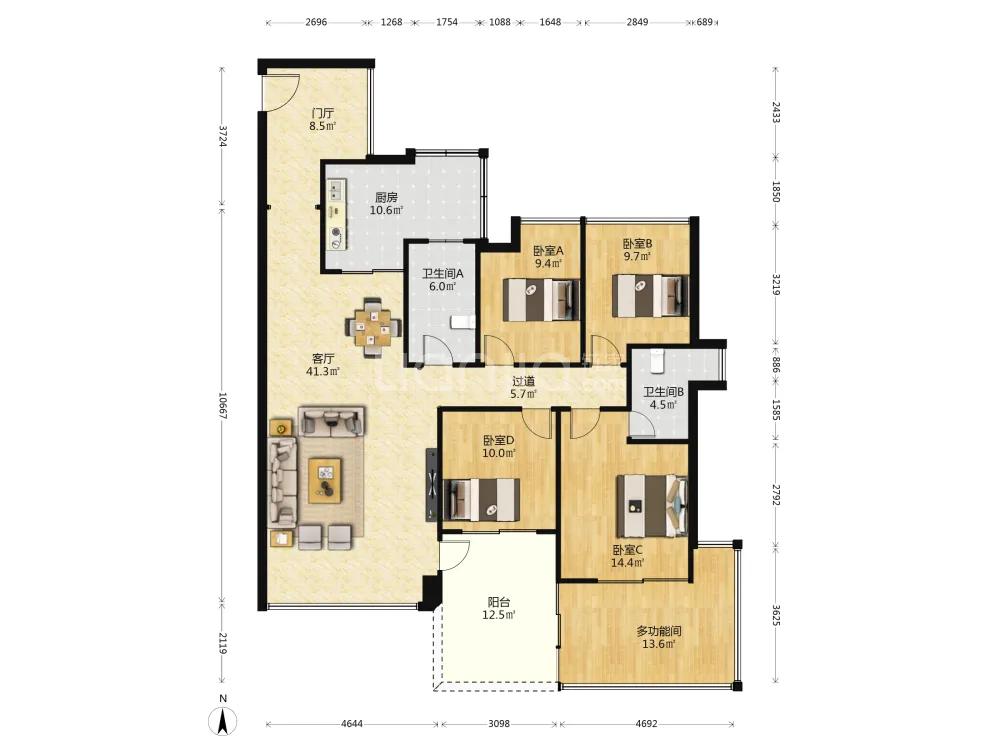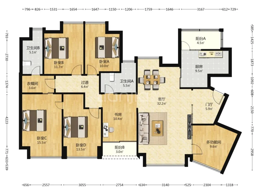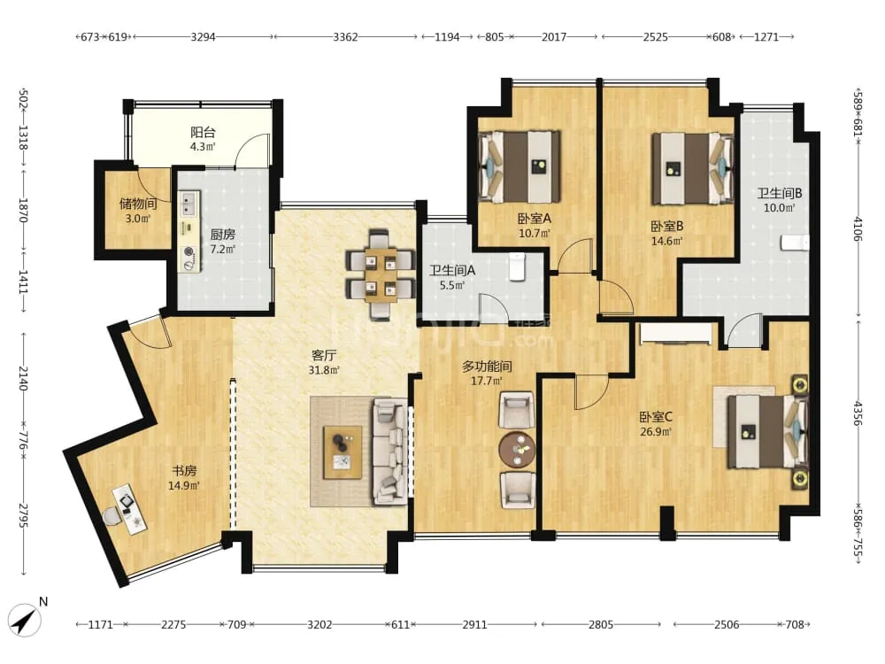 3. 动静分区明确:卧室集中于一侧,客厅、餐厅位于另一侧,互不干扰,居住舒适度高。