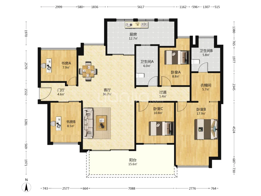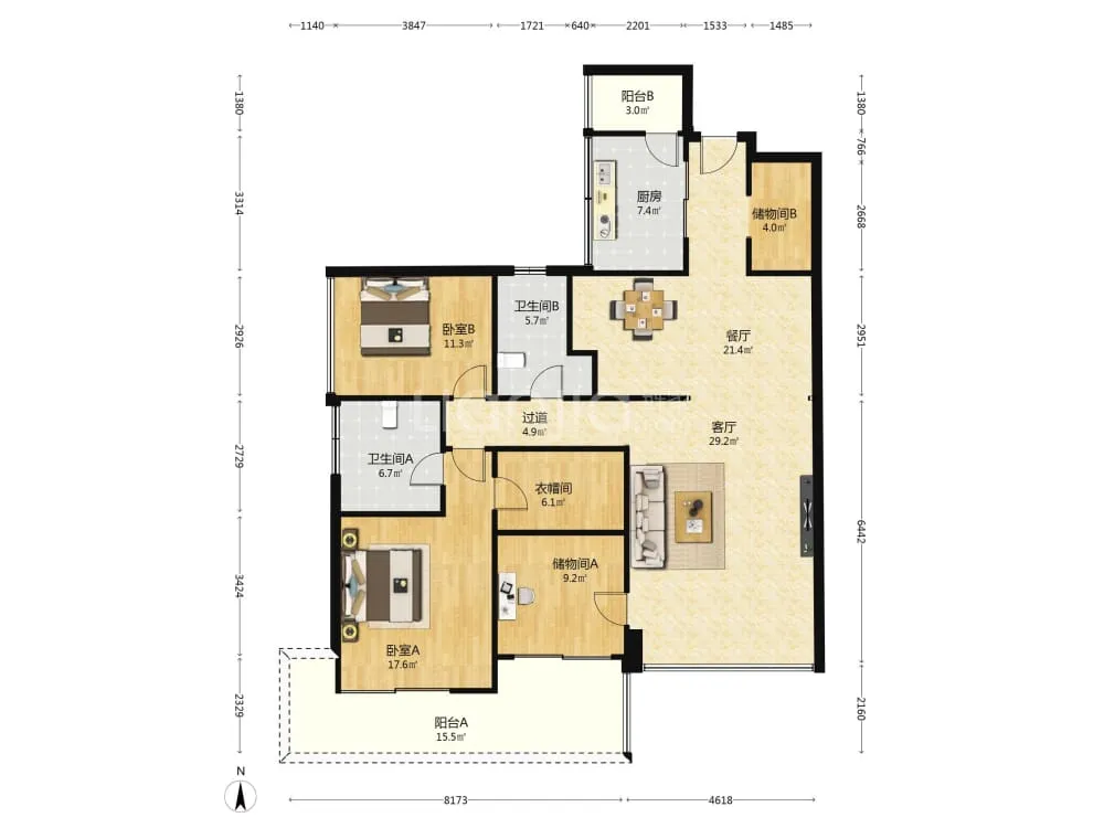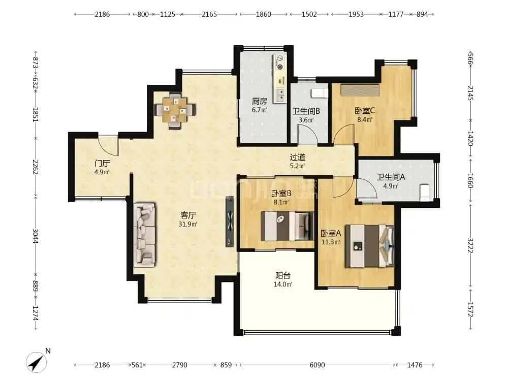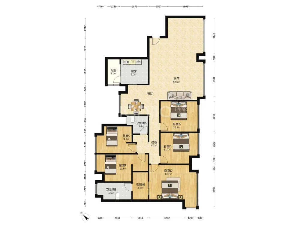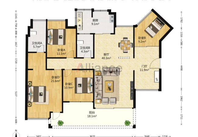 3. 动静分区明确:卧室集中于一侧,客厅、餐厅位于另一侧,互不干扰,居住舒适度高。