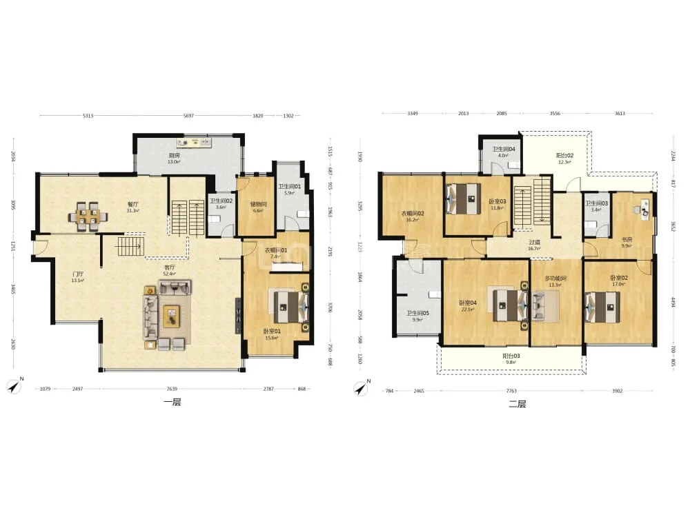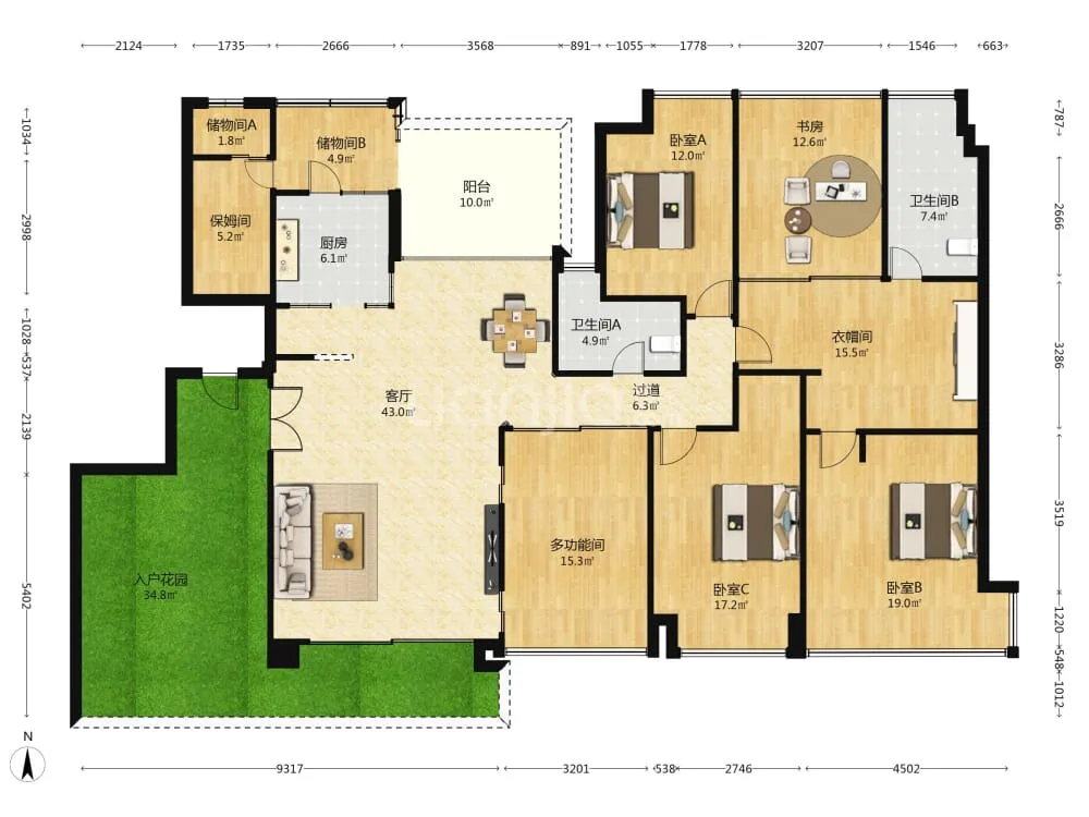 餐客一体大横厅,客厅开间约5.8米,空间开阔;前后双阳台/大露台设计,拓展家政与休闲空间;主卧套房约80㎡,含独立书房、超大衣帽间、干湿分离卫浴;多房间朝南,全明格局,通风采光拉满;部分户型带保姆间,实用性强。