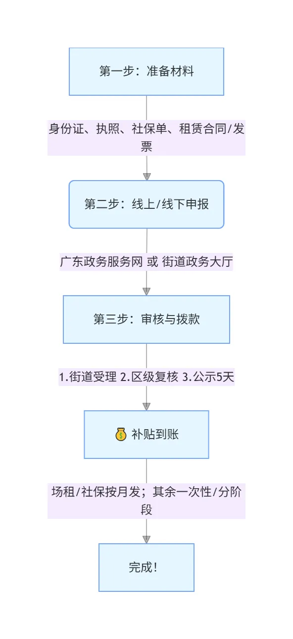 1️⃣备材料:身份证 + 营业执照 + 社保缴纳记录 + 租赁合同 / 租金发票线上:广东政务服务网 → 搜索 “创业补贴” → 选企业所在街道申报