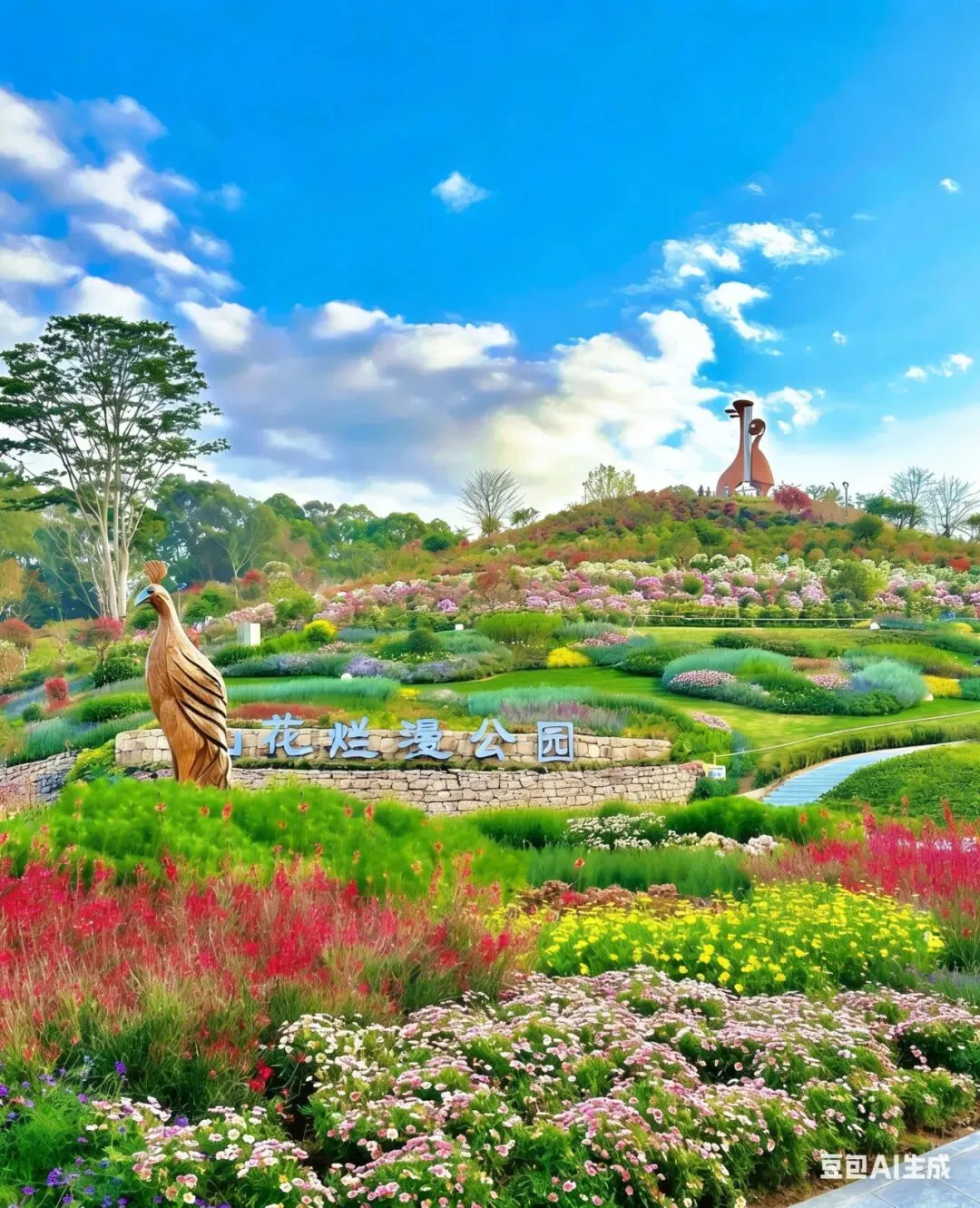 公园由黄金山公园升级而来,4.5万平方米的空间里,春日美景拉满。漫山的簕杜鹃开得热烈,红、粉、紫三色交织成浪漫花毯,30米长的三角梅花瀑倾泻而下,光影交错间美到犯规;西坡的紫色马鞭草花海自带氛围感,花田间的石板小径直通花海深处,小朋友穿梭其中,仿佛走进童话漫画世界。