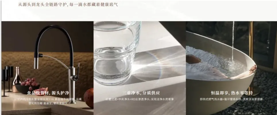 比如水。 200㎡以上的户型,除了标配的前置过滤、中央净水、RO反渗透,还多了一套中央软水。深圳自来水硬度30-120mg/L,它给你降到≤10mg/L。洗澡更护肤,洗衣服更蓬松。