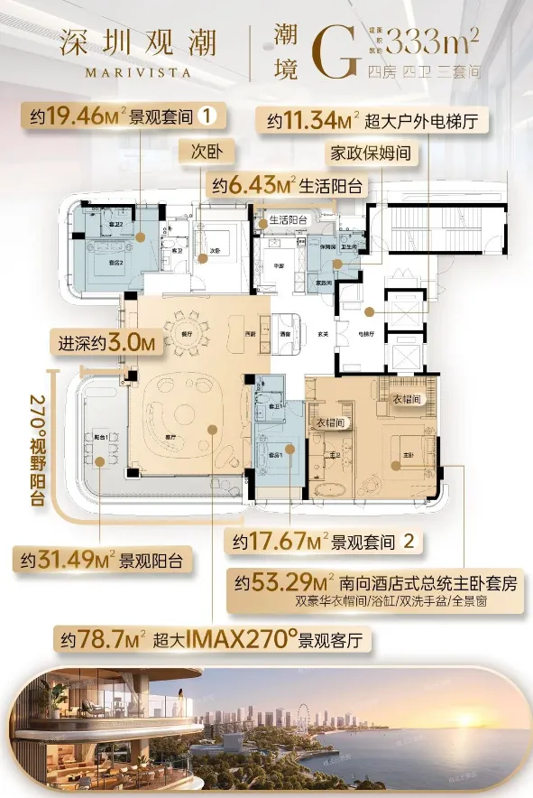 环幕360°全景舱,南向面宽约21.4米。主卧面积约53㎡,相当于别人一套小两房。
