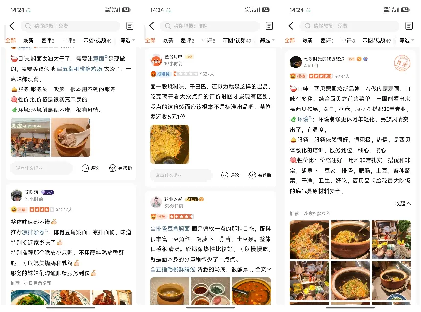 而在大众点评上,也有不少资深吃货给出了好评。网友“七秒时光的吃货旅途”给出五星好评,称其结合了西贝之前的菜单,用料扎实、干净卫生。“西贝品牌给我最大的吃饭底气就是原材料安全”;另一位网友“艾吃辣”则推荐了排骨豆角焖面和脆皮小麻鸭,认为味道特别接近家乡味,小麻鸭的酥脆程度甚至能媲美烧鹅和乳鸽。